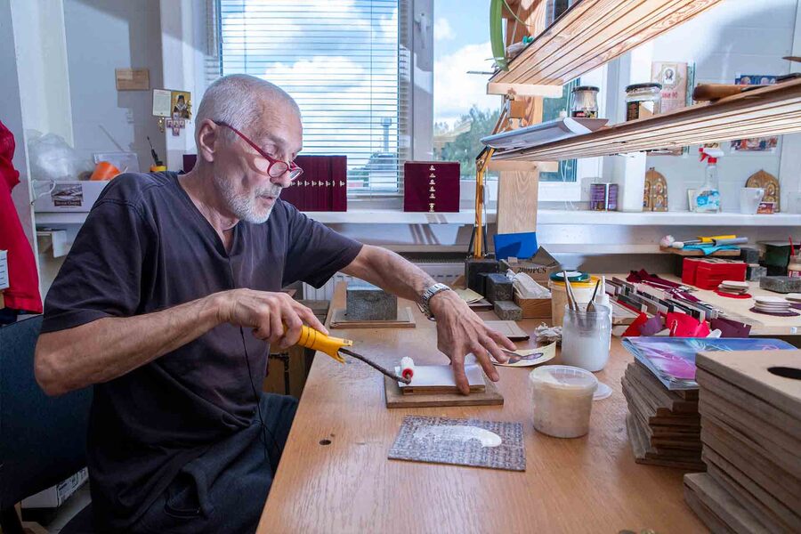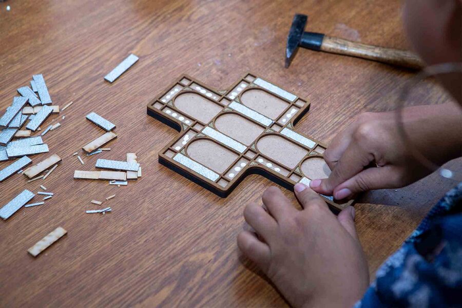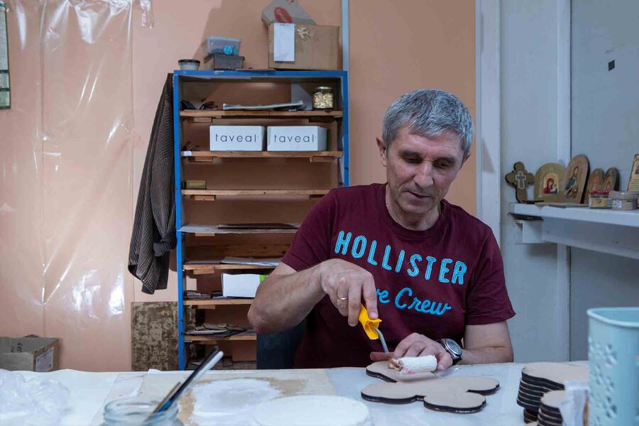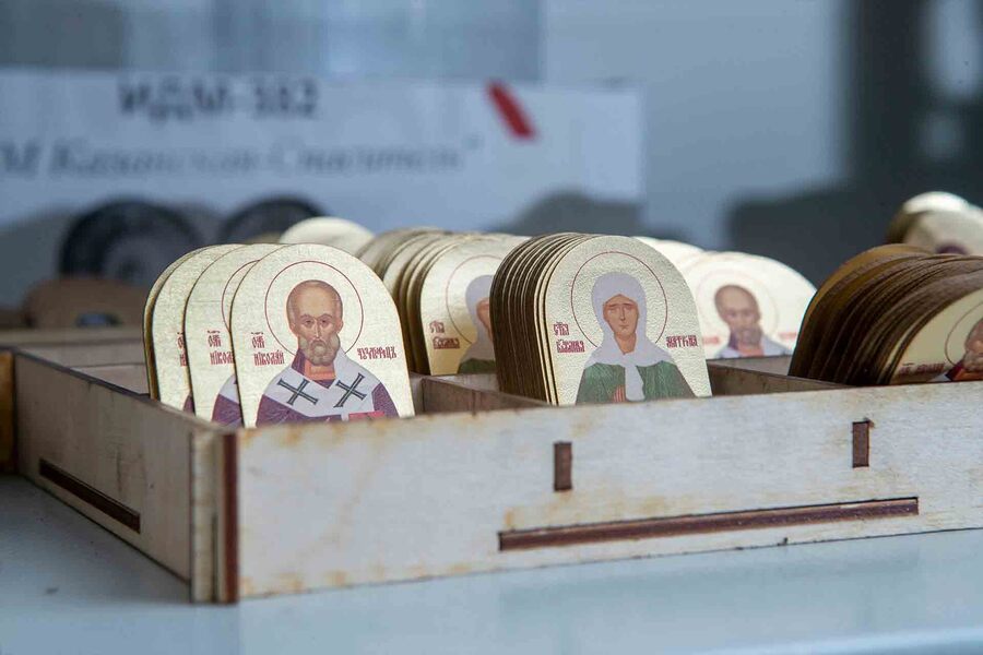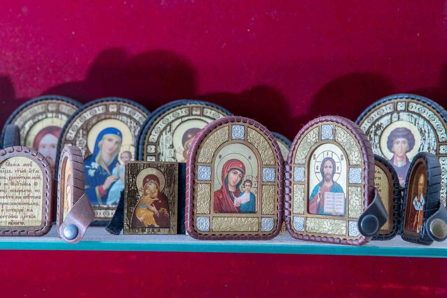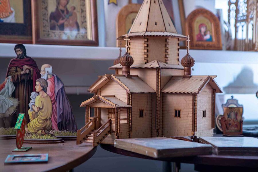 The skilled artisans of the workshop continue creating wonder after wonder. Working with plywood, leather, and wood, they craft crosses, icon covers, belts, and children's building sets. Nikita Provlotsky's photos capture their delicate work.