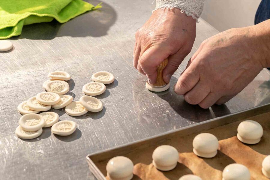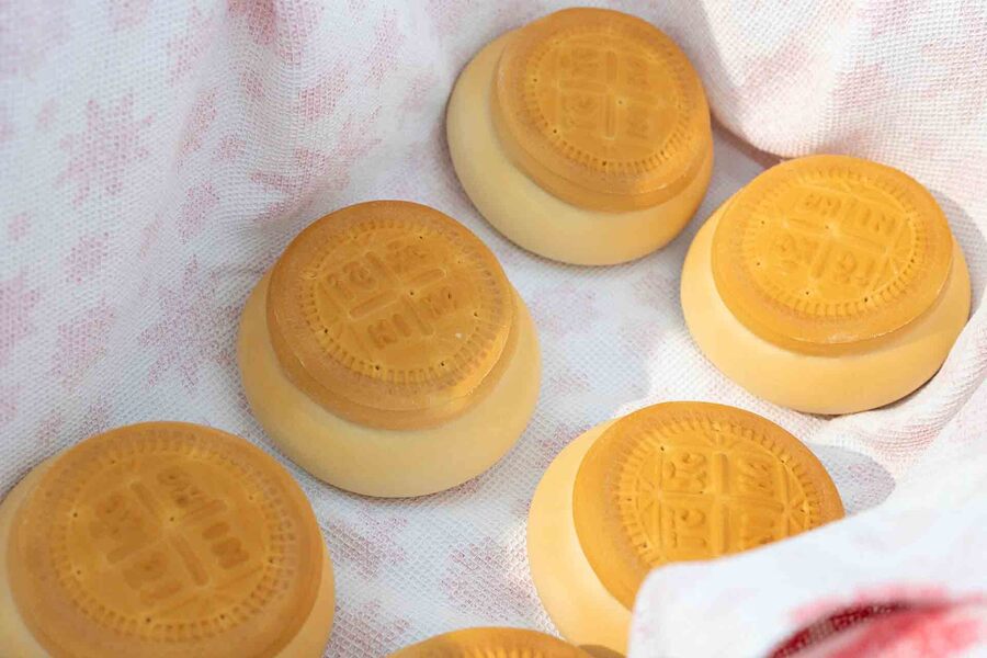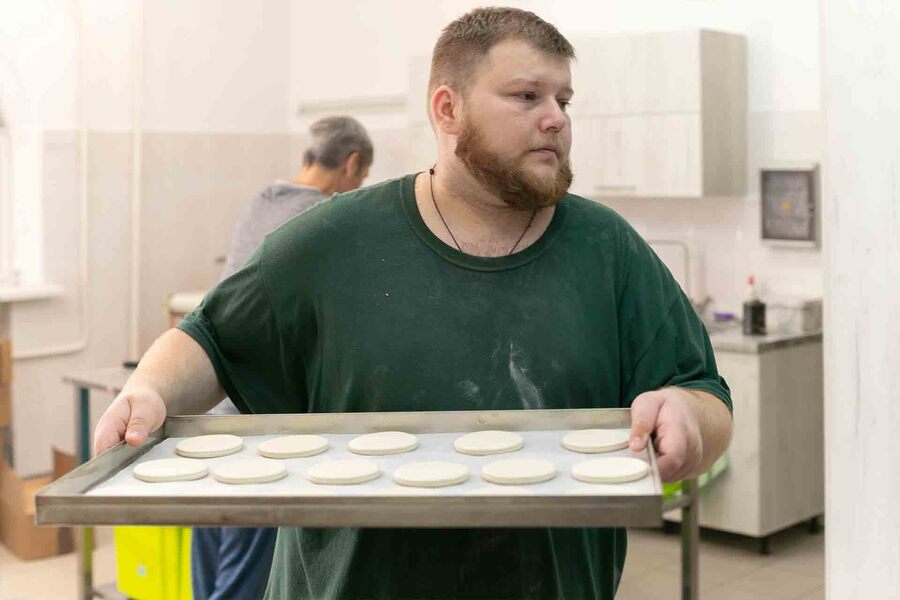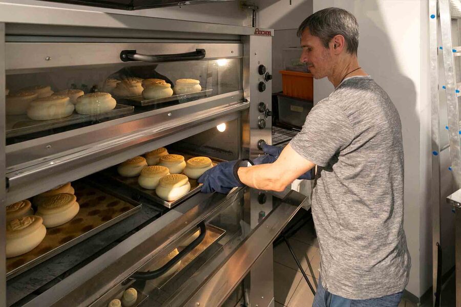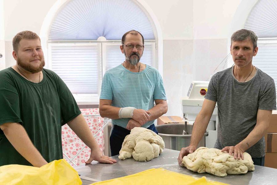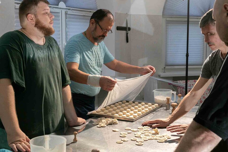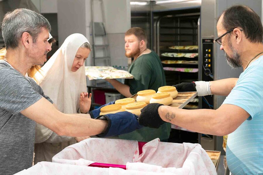 In quiet and prayer, the holy bread is prepared in our bakery. Stamped with the inscription IC XC NIKA (Jesus Christ Conquers), it is used during the Liturgy and shared with the faithful after Holy Communion. Photos by M. Chernogolov.