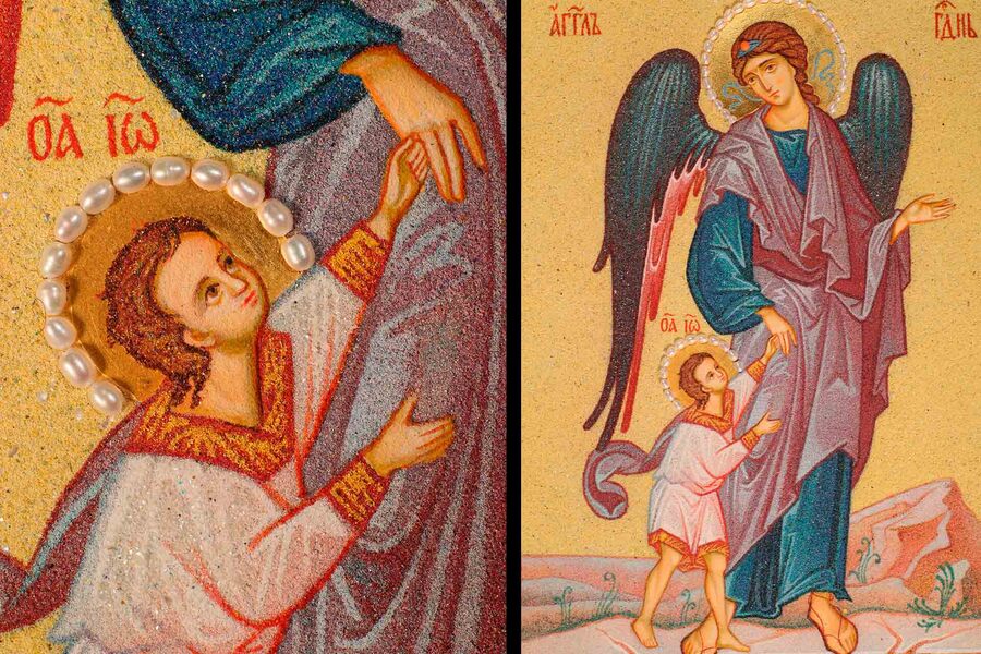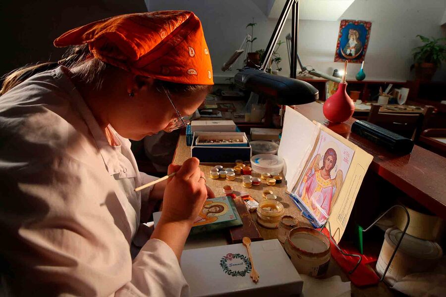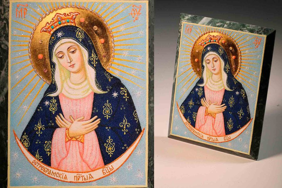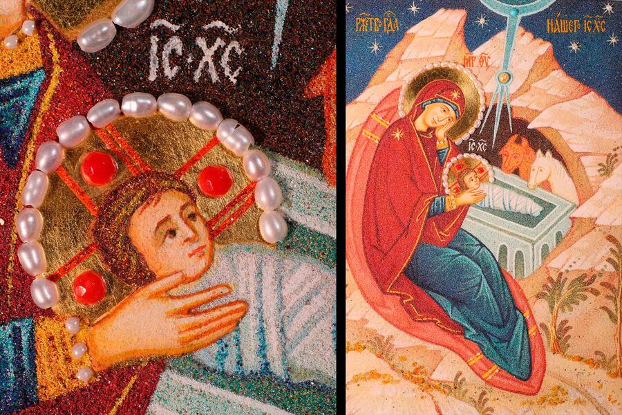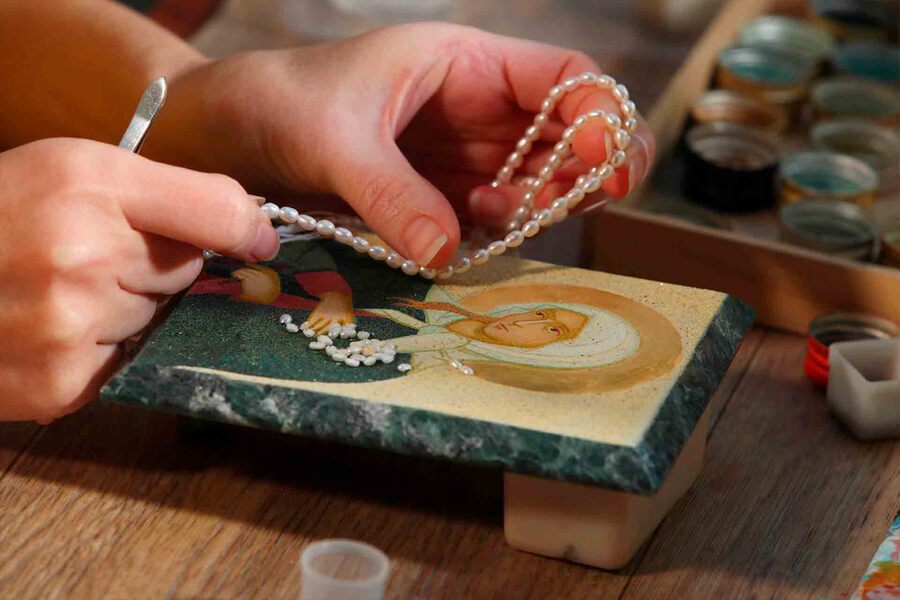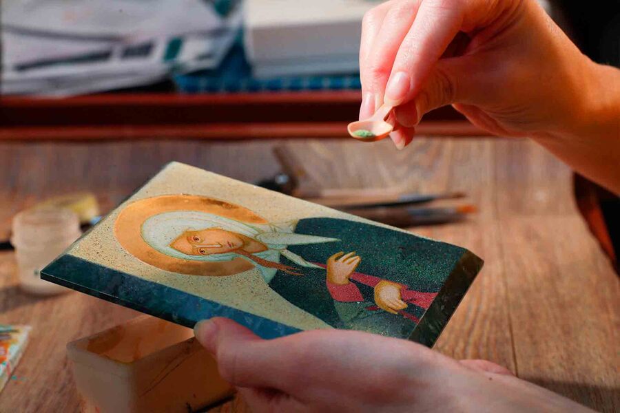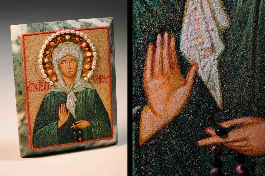 Our artists use amethyst, amber, turquoise, malachite, agate, azurite, coral, magnesite, cinnabar, pearls, garnet, etc. to create icons. The quality of natural materials makes crushed stone icons almost ageless. Photos by Maxim Chernogolov.