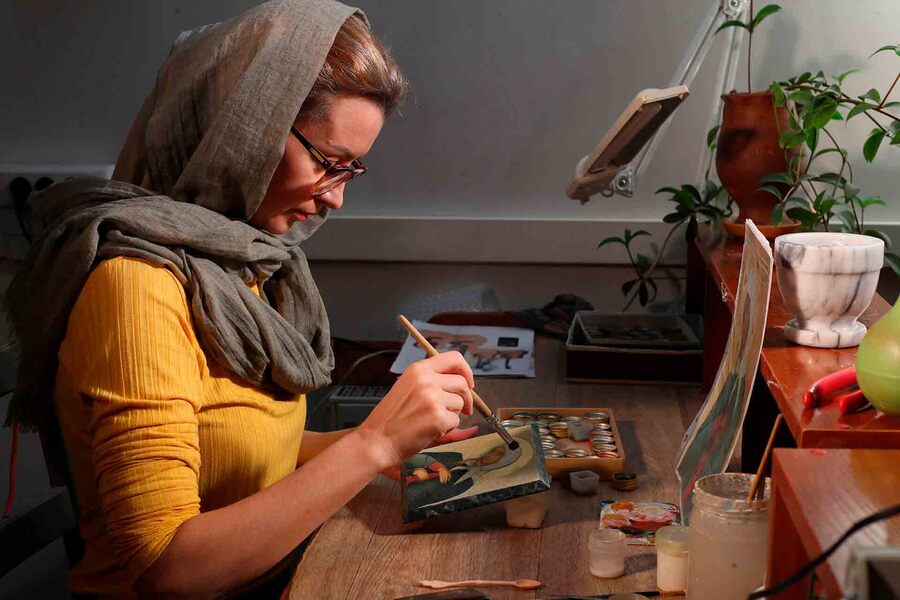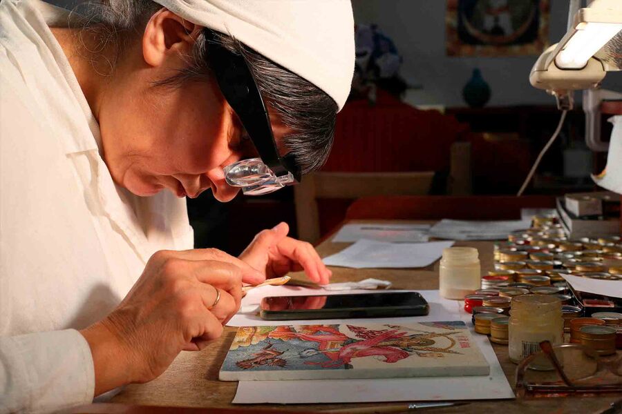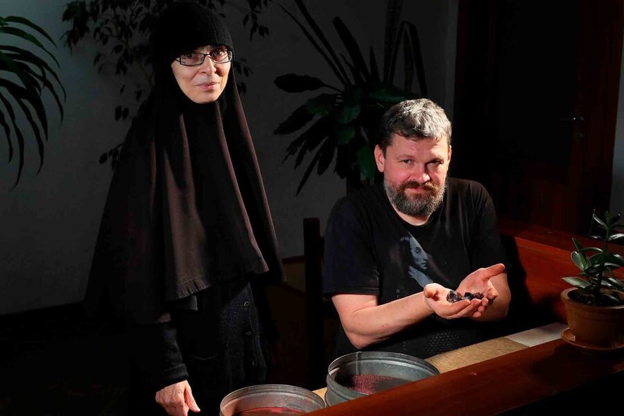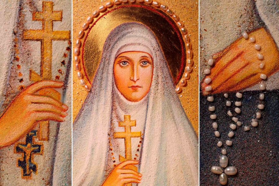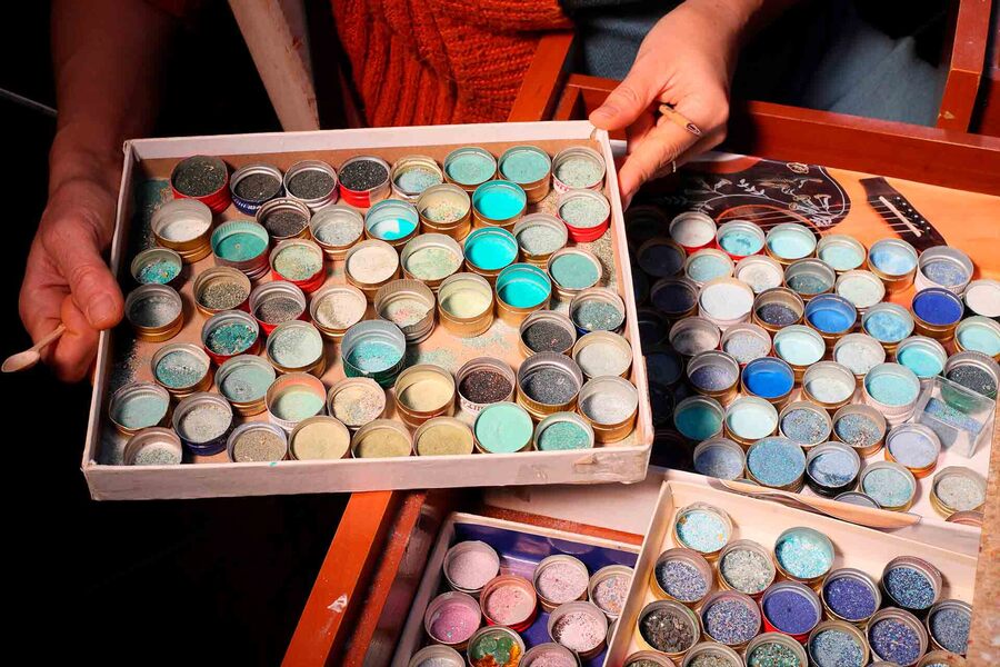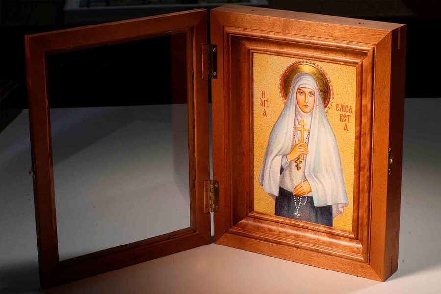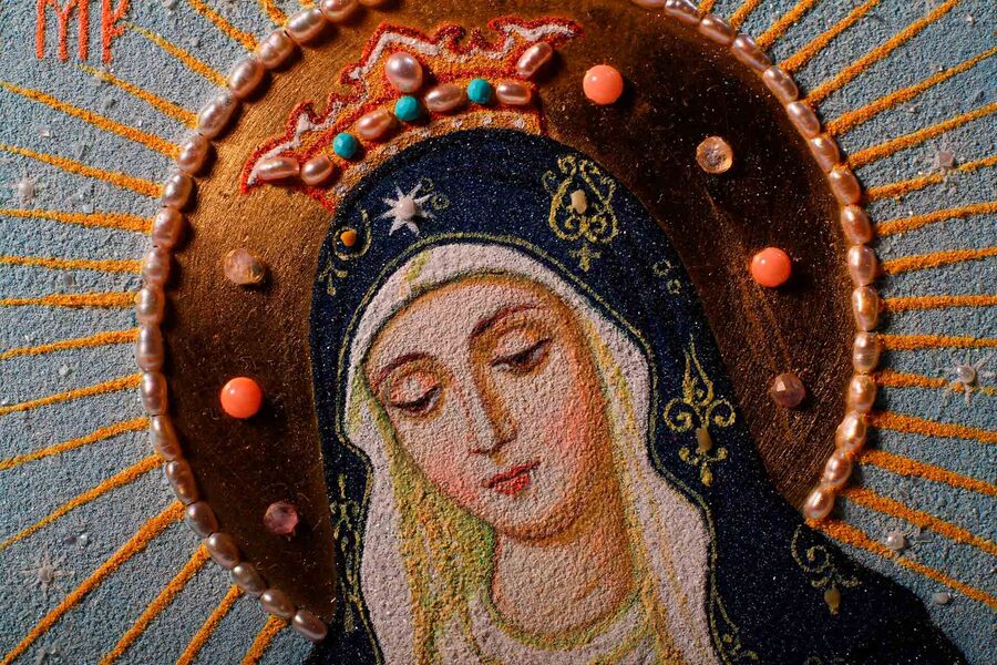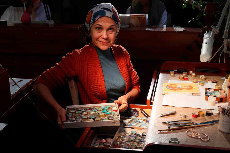 Our artists use amethyst, amber, turquoise, malachite, agate, azurite, coral, magnesite, cinnabar, pearls, garnet, etc. to create icons. The quality of natural materials makes crushed stone icons almost ageless. Photos by Maxim Chernogolov.