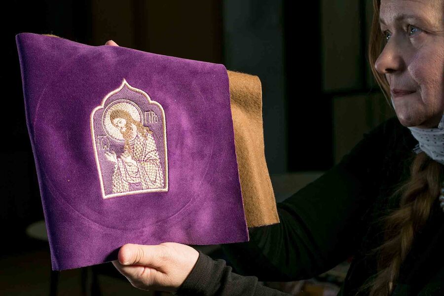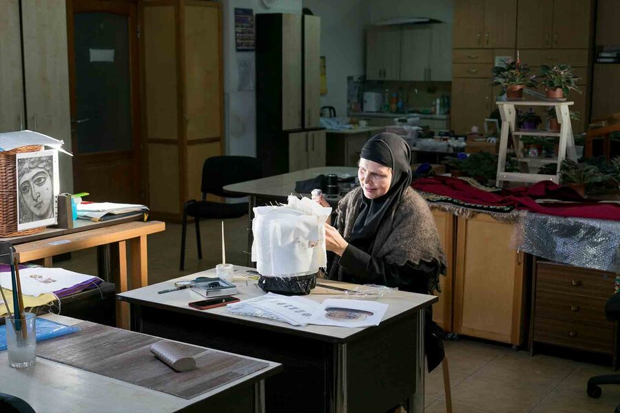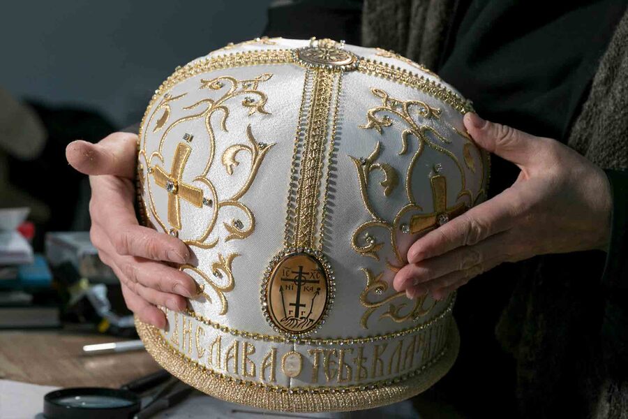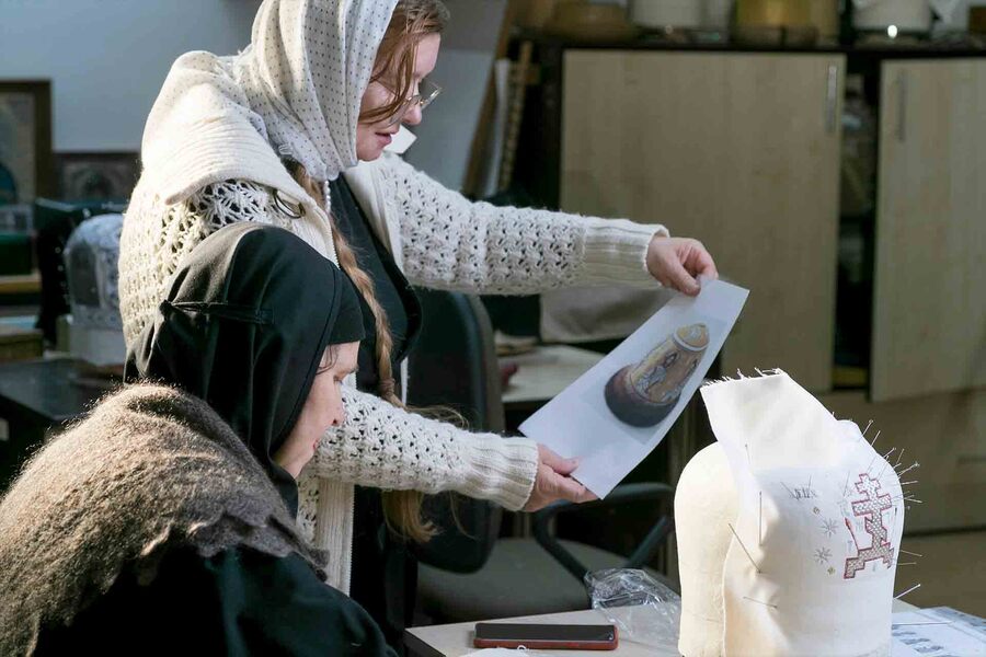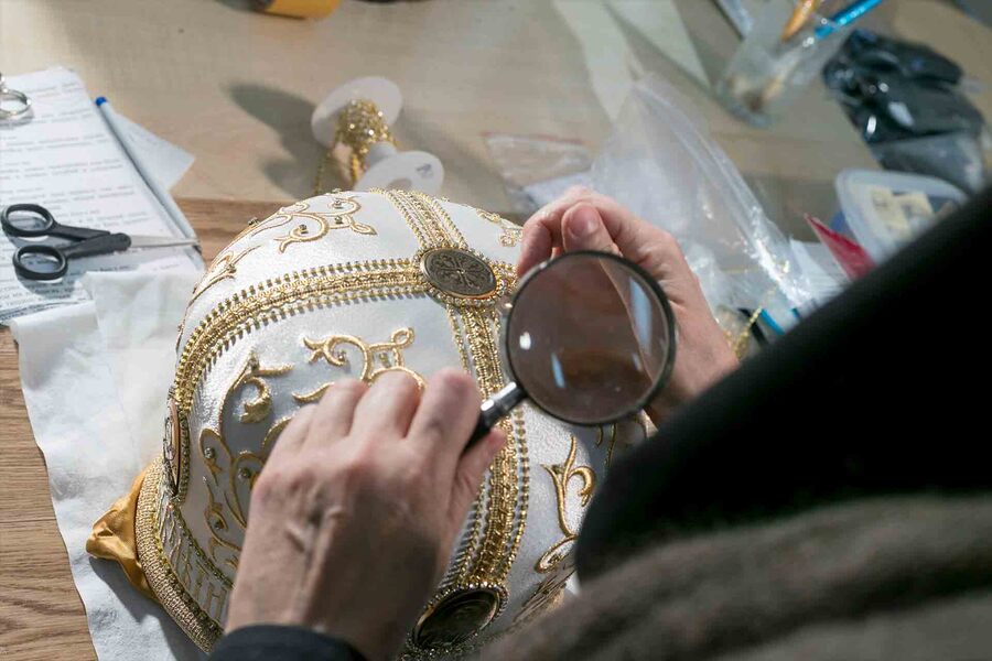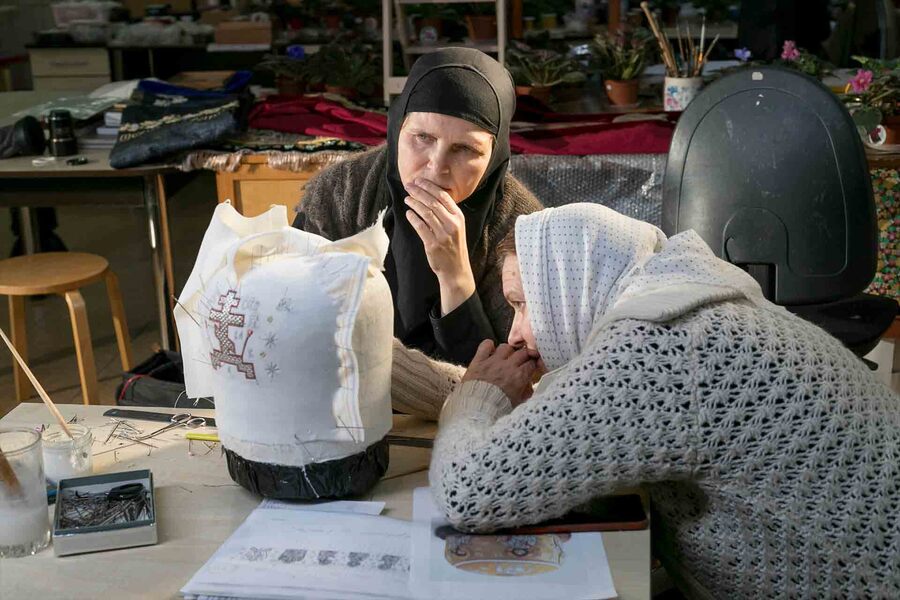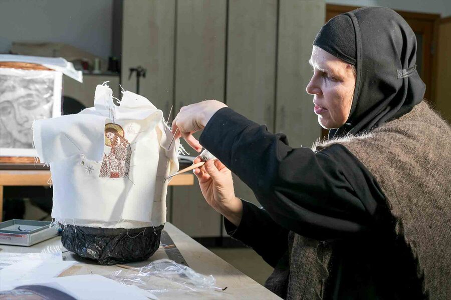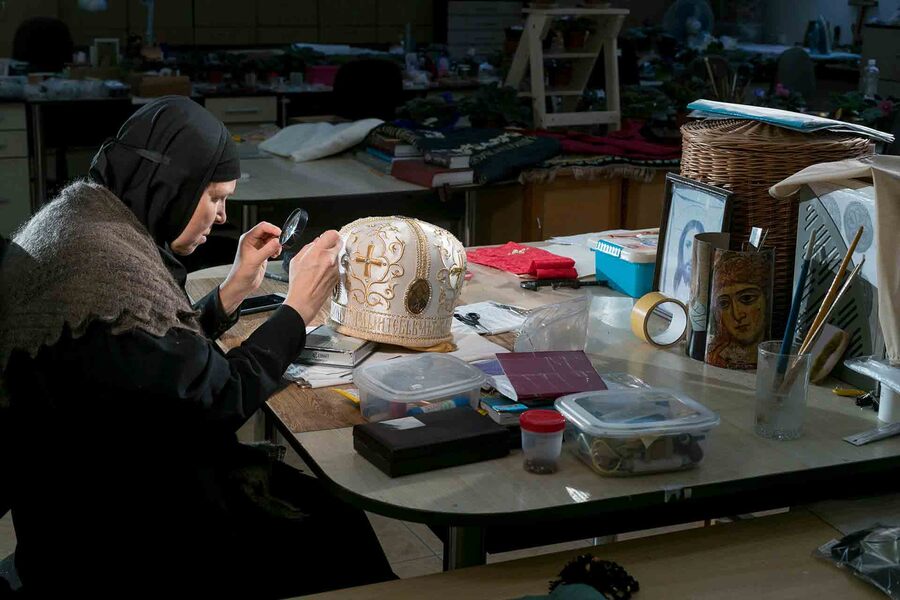 In our workshop, a quiet and prayerful atmosphere surrounds our embroiderers at work. With loving care, they adorn sacred vestments using golden and silver threads, beautiful fabrics, and gleaming gemstones. Photos by Maxim Chernogolov.