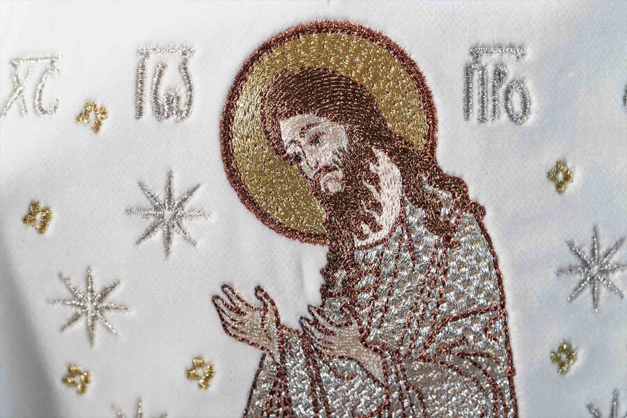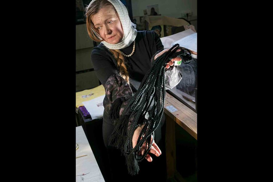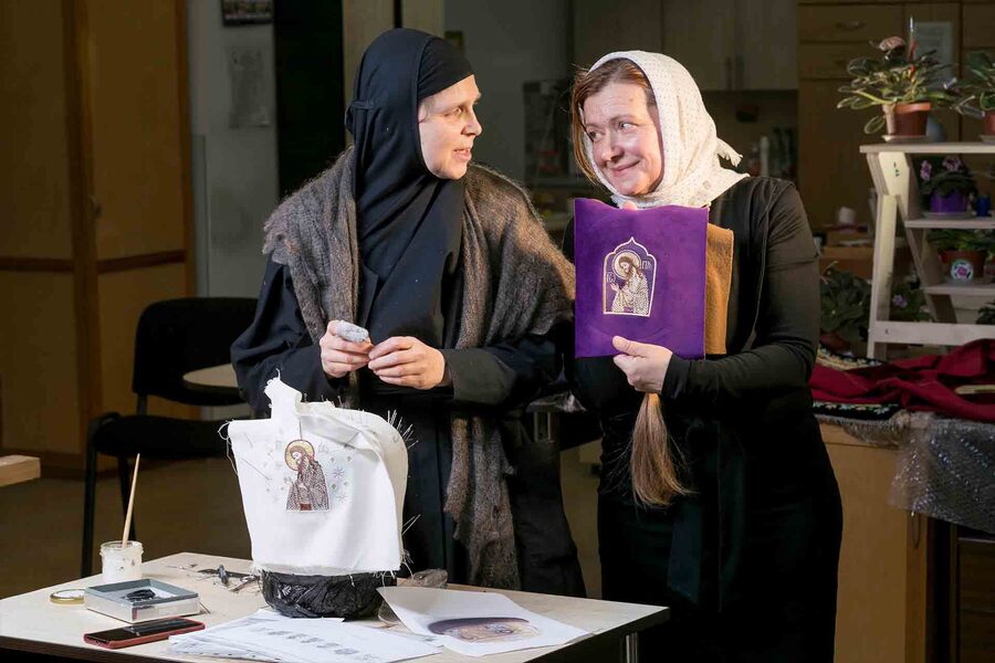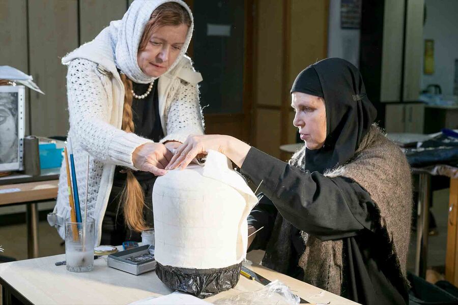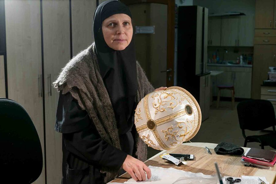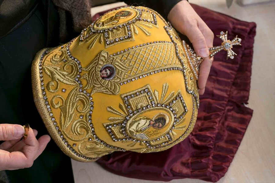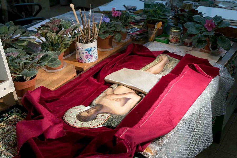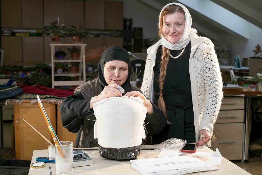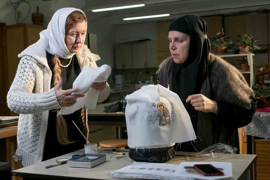 In our workshop, a quiet and prayerful atmosphere surrounds our embroiderers at work. With loving care, they adorn sacred vestments using golden and silver threads, beautiful fabrics, and gleaming gemstones. Photos by Maxim Chernogolov.